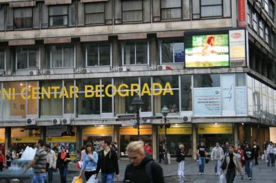 There was an interesting little downtown pedestrian area, with modern swanky Euro boutiques, above which is one of those incredibly obnoxious giant TVs showing a looped set of commercials, which while I was there relied heavily on an ad for an indiscernible product featuring a woman in torn acid washed jeans, a striped neon blouse, suspenders and a headband dancing around, poorly, in various areas of an anonymous city after apparently time traveling from the mid 1980s. It was like Cindy Lauper had emerged from her time capsule and decided to boogey down in Anytown, Serbia.