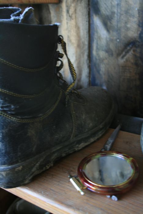 (No full mirror in the Single Brothers’ Room bunk house, but for functional need there was this little one available on top of the rack for dusty work boots.)