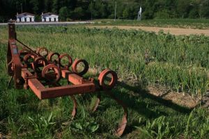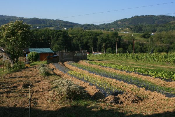 The fields and greenhouses reach out beyond, across a recently cleared creek bed on one side and down to the highway on another. International shipping trucks speed by and insane Basque cyclists streak down the asphalt lanes without a glance up the hill to where rusty hoes clear rows between straight beds of green onions, leeks, and lettuce. Dropping dry corn kernels and green bean seeds by hand into the ploughed rows I could look across to the commuter trains hurrying along their way, and feel glad of my place.