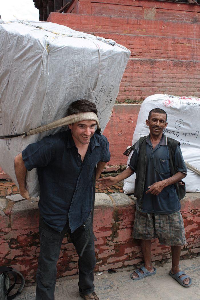 He was handy for keeping the other touts away though, and at the Trailokya Mohan Narayan temple (whose window carvings date back to 1680 by the way) he spoke with one of the guys resting from their never-ending work of carrying massive burdens across town on their backs. Chico smiled and told me the guy had agreed to let me try his burden, and that I was lucky, it wasn’t very heavy that day. I fit the greasy strap over my forehead and stood up to find that apparently local’s aren’t used to this sight, and a surprisingly large crowd had gathered to watch me hobble around. No, that wasn’t embarrassing or anything. (That’s one of the things I love about travelling. I can humiliate myself, and be anonymous again ten minutes later.)