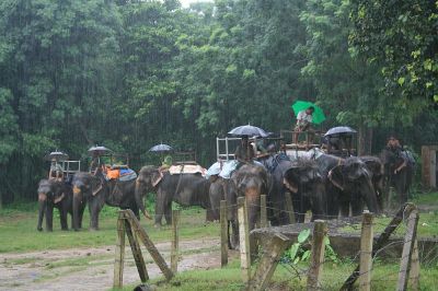 One of the tourist activities is bathing the elephants in the river, but the pouring rain makes the river dirty and the elephants don’t like it, so for our elephant bath we watched it following the mahout’s barked instructions to fill its trunk from a well-pipe, then spray it over its back and us, while we scrubbed its skin with pieces of broken bricks. Now that’s micro-abrasion skin therapy. We found a couple big purple lumps that seemed different, but didn’t come off when we scraped them with the bricks. It’s hard to get leeches out of elephant skin, the mahout really had to twist and yank the things.