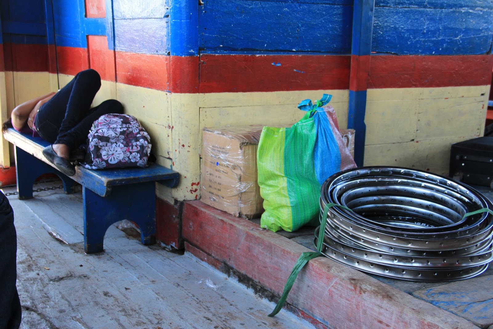 It was definitely a boat for work, not show. (Just like the dogs.) It seemed somehow more handmade than any other boat I can think of; three men raised the anchor by hand, no winch system here, no words of communication or coordination necessary; a leathery man with a square jaw pumped the bilge with a chipped tree branch for most of the crossing. There was a space in the middle for baggage, loaded with one of those ubiquitous plastic carry-all bags, a stack of a dozen bicycle tire rims, and a decrepit cardboard box that was originally for 20 pieces of pork, 19.5 kg, though its present contents are anyone’s guess.