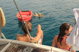 | Lotsa swimming, few pictures. Fernando & Mariana on the boat, Jessica swimming by El Diablo Rojo, the boat’s dinghy, which trailed along after us. |