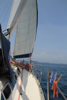 We cruised for awhile on diesel then cut the engine, Dino showed me which rope to heave on, the sail was raised, and we were sailing in the San Blas Archipelago. Absence of combustion engine noises, the slap of water, wind all around, soft soft, and our bodies relaxed. The crew facing forward while the passengers chatted about Carnaval.
