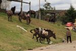 Around the periphery were the means of transportation for the people who had come into town for market day, cars below in the gravel lot, and donkeys and mules above on the grassy hillside. I watched one rugged fellow in a dusty poncho get in a tussle with his mule, holding tight to the reins and sneaking his hand up and up and then lunging for the ear as the mule ducked its head. He was faster, gave the ear a visible twist, then lead his subdued beast off for the walk home.