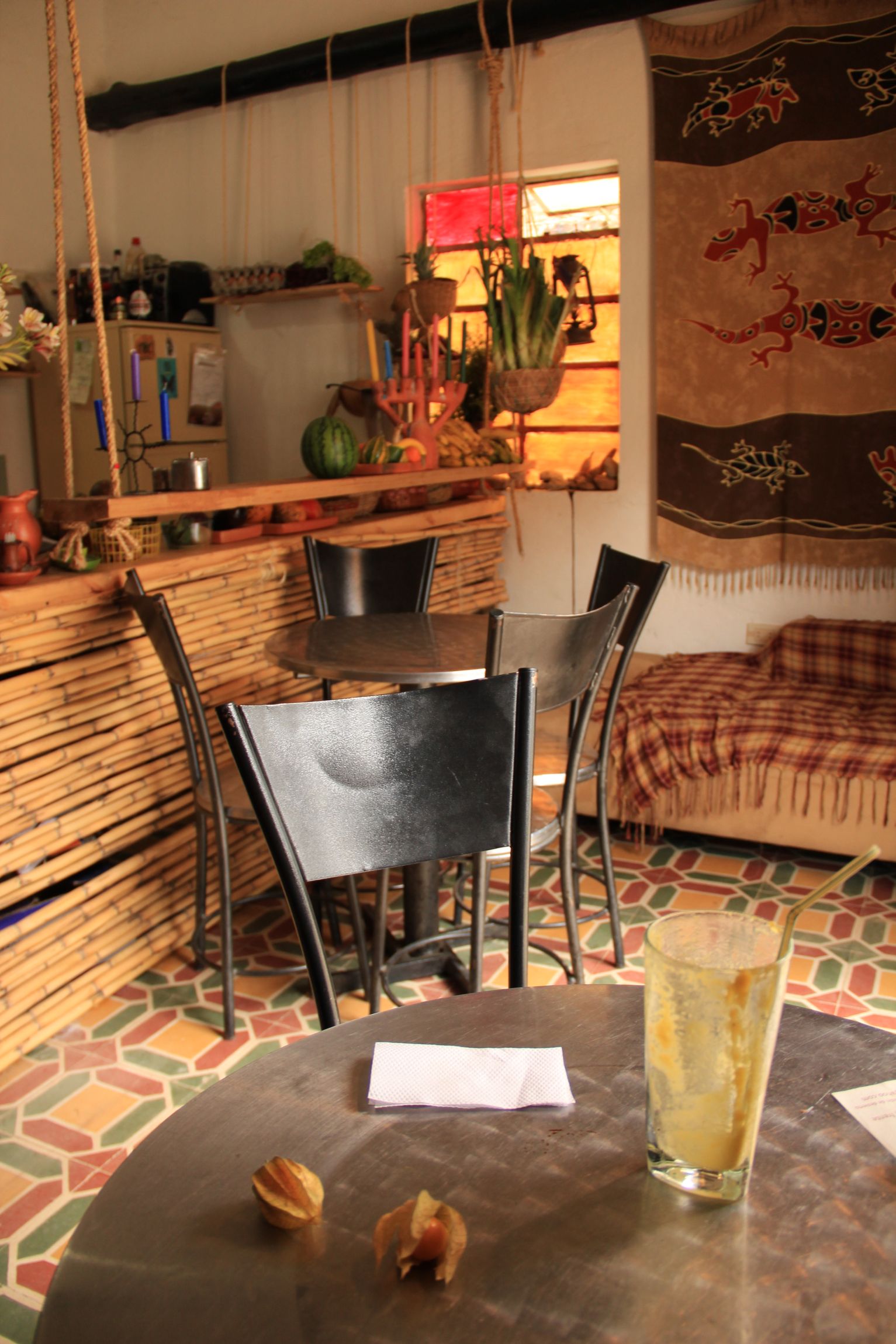 That first morning we couldn’t find changua we ended up at a vegetarian restaurant called Casa Salud Natural which had a super laid back vibe, occasional weird Indian homeotherapeutic stuff on the TV, and a Hari Krishna cook with an excellent feel for spices. K’s favorite breakfast of fruit, yogurt, and granola came with a layer of quinoa on top, and I found myself staring at a Colombian tamale.