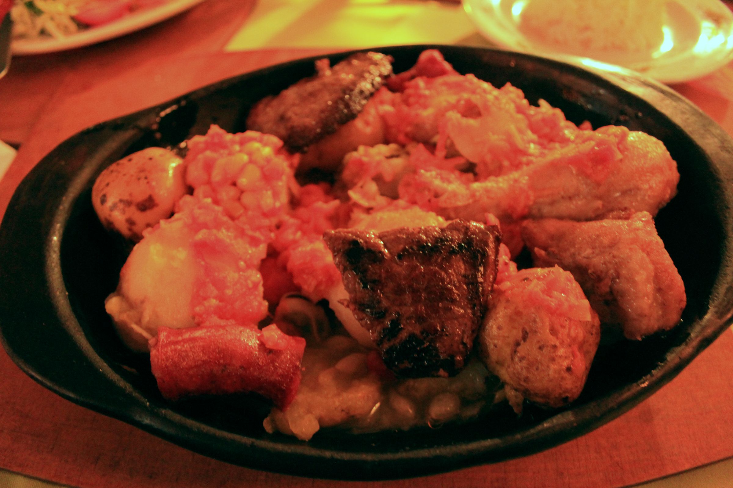 But the point of the dish is the collection of meats, which included just about every beast in the neighborhood (except dog, I‘ll probably make it to China someday…I have until then to decide on that one). I had a chicken drumstick, a lump of pork with a nice layer of jelly fat on it, a couple blades of tough beef, and a couple pieces of longaniza, a chorizo-like pork sausage.
