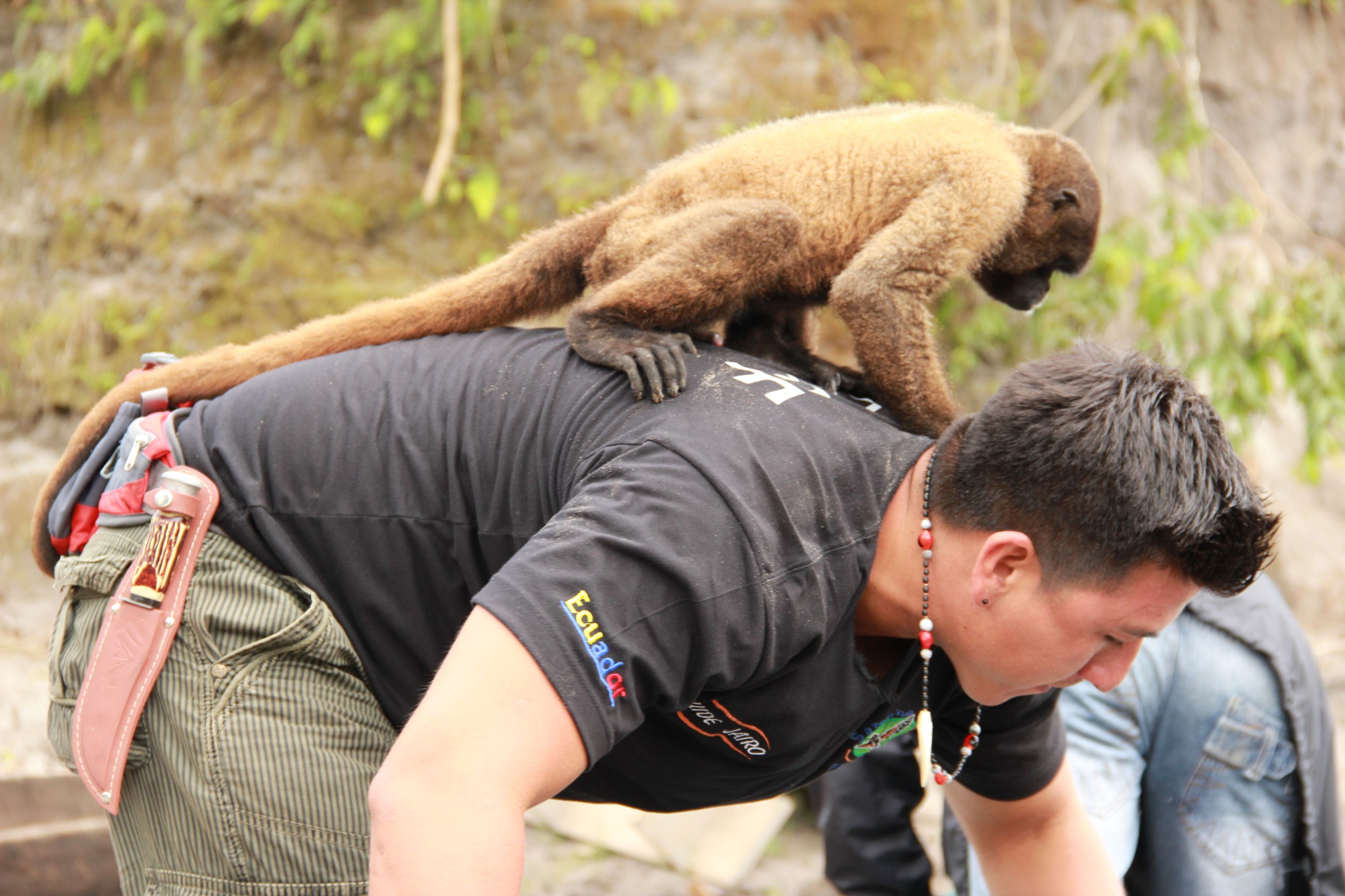 We heard a chirping sound like a hummingbird, and a tiny handful of animal came galloping up to me, then up me, climbing my pant-leg, shirt, and onto my shoulder with quick grips of its tiny claws. There was a pygmy marmoset riding on my shoulder.