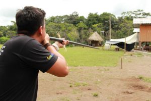 While we waited, Jairo brought out a blowgun (made from the core of a palm tree wrapped in black duct tape), still used to hunt bush meat, using poison from the poison dart frogs (the “ruby“ one was my favorite) who excrete it from their backs when threatened. One session of annoying a tiny frog and rolling darts on its back produces enough poison to kill multiple animals.