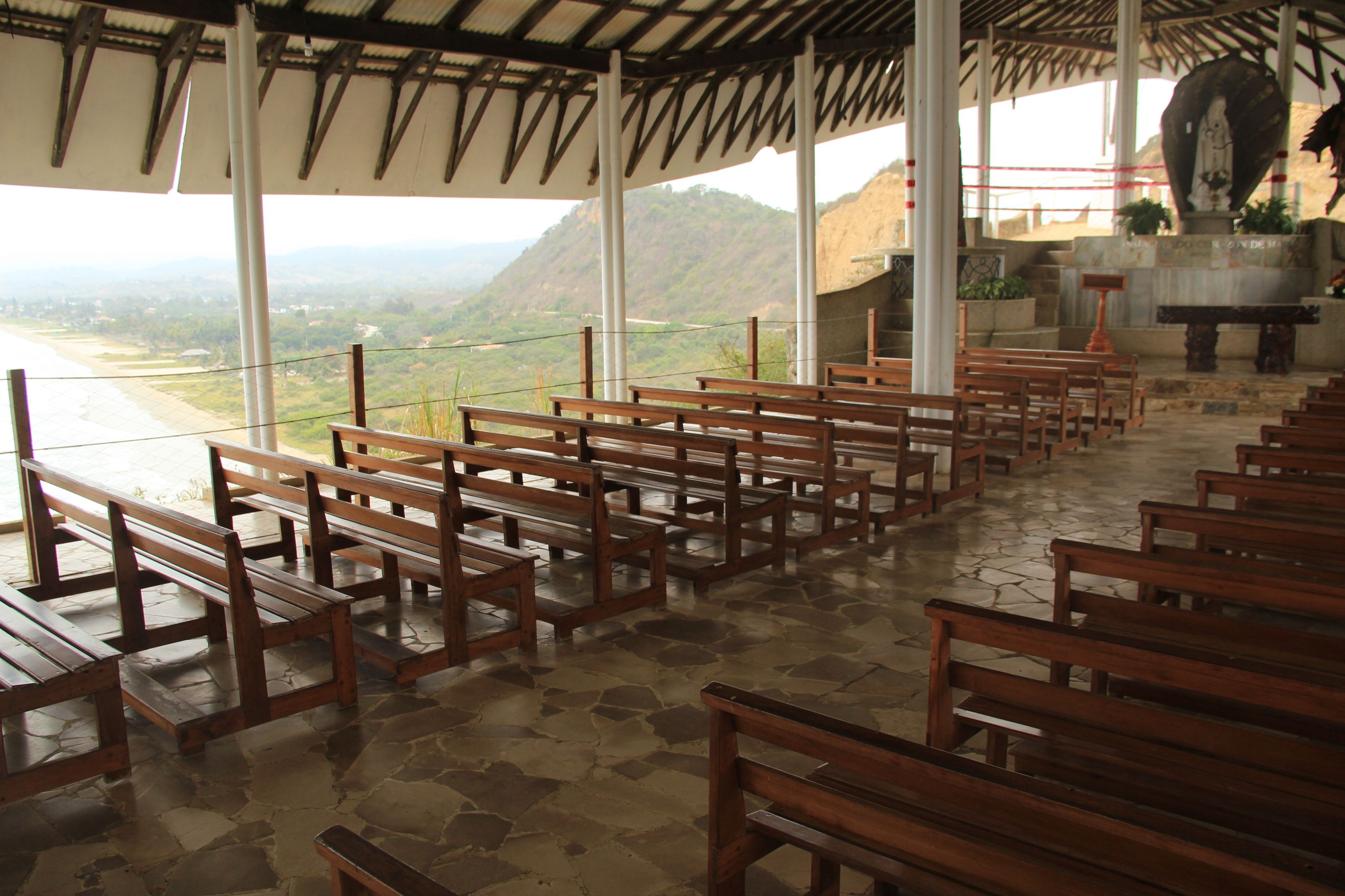 Ecuador’s coastline is punctuated by giant ridges of stone that jut into the sea, leaving long stretches of sandy beach borded on each side by steep cliffs, like lines on a geological measuring stick of Beauty. One of these extends just north of Montanita, with Olon on the other side, and as we rode past I noticed a chapel of some kind perched on top. A faded poster on the chipped wall of the hotel labelled it El Santuario de Olon, so on the afternoon of our day in town we walked up there.