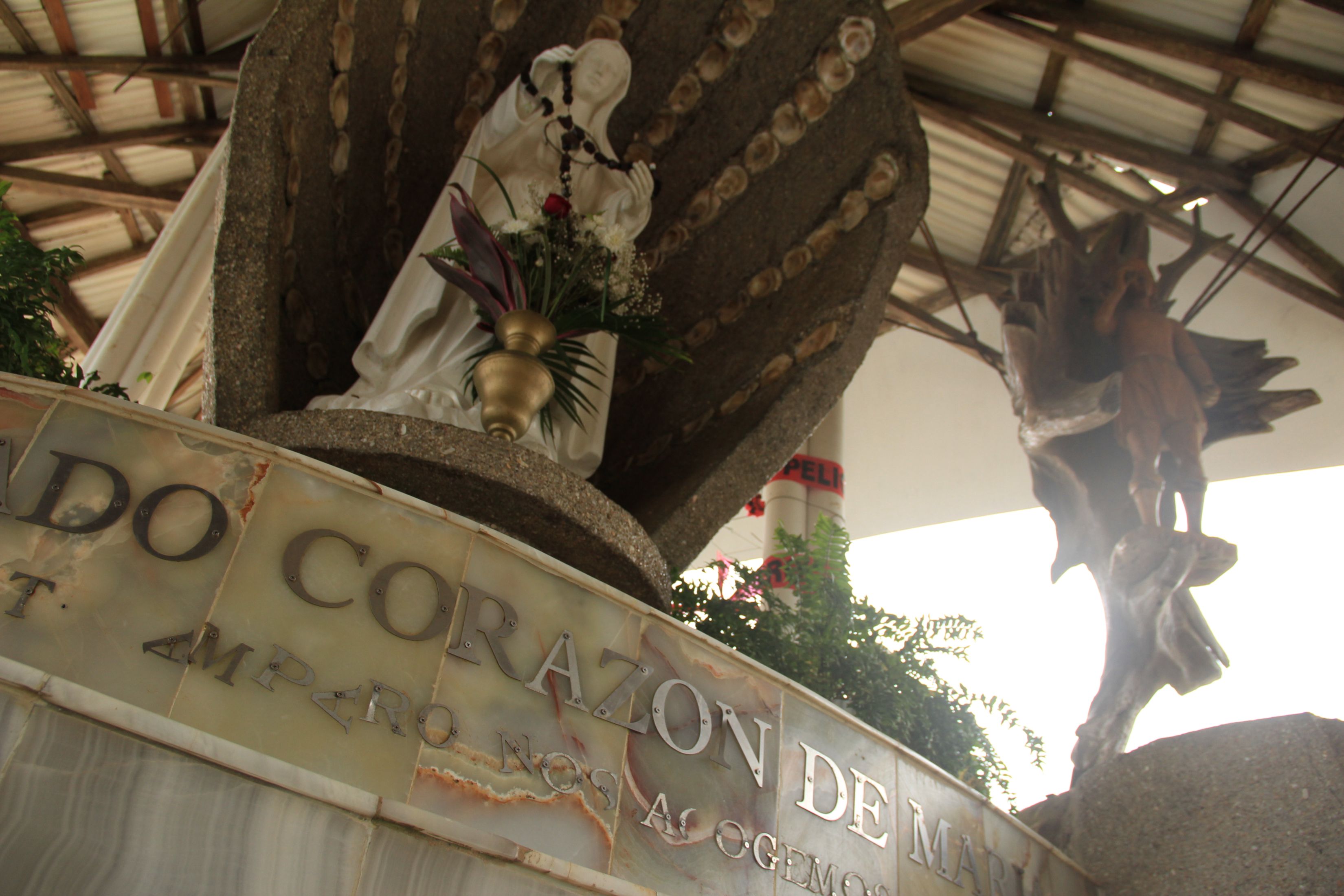 Inside the hull was a small grotto room, still reached by wind carrying the sound of surf, in which stood a statue of Maria Rosa Mystica. Please correct me if I’m wrong, but the spare signage in the chapel (and some googling) indicate she is the version of the Virgin Mary who began appearing 1947 in order to urge some reform on the church, and to remind the faithful of her priorities.