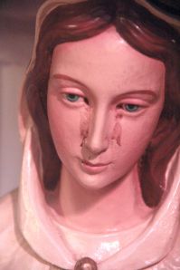 She has appeared many times over the years, although since seven appearances in 1947, she seems to manifest only through her statues, which then cry, sometimes tears, but usually blood. The one in Olon apparently wept blood for several hours in 1990.