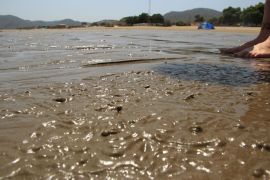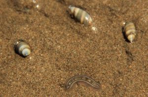 Puerto Lopez was another broad sandy beach, which at low tide became a swamp of squirming squeezing squelching things in shallow salty splendor. There were of course crabs, ejecting water from their wave-flooded dens to create a miniature moonscape of pebbles and craters. And I was now familiar with the tiny corkscrew snails and the filter-feeding creepy-crawlies, but I’d never noticed the little amoeba things that went sliding around like escaped particles of paisley.