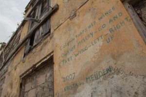 K: Coming back from the bathroom, a carefully neutral expression on her face. In an open and airy voice “De badkamer is echt vreselijk. Het ruikt er slecht, de vloer is zwart met schimmel, en ik denk dat er bloed op de muren is.”