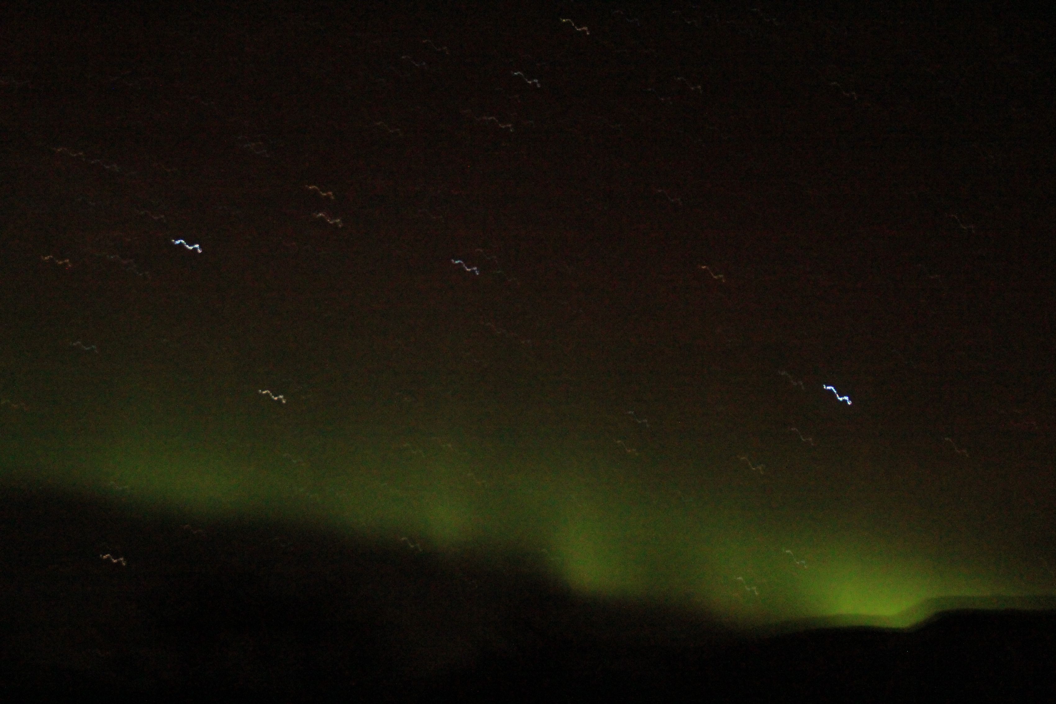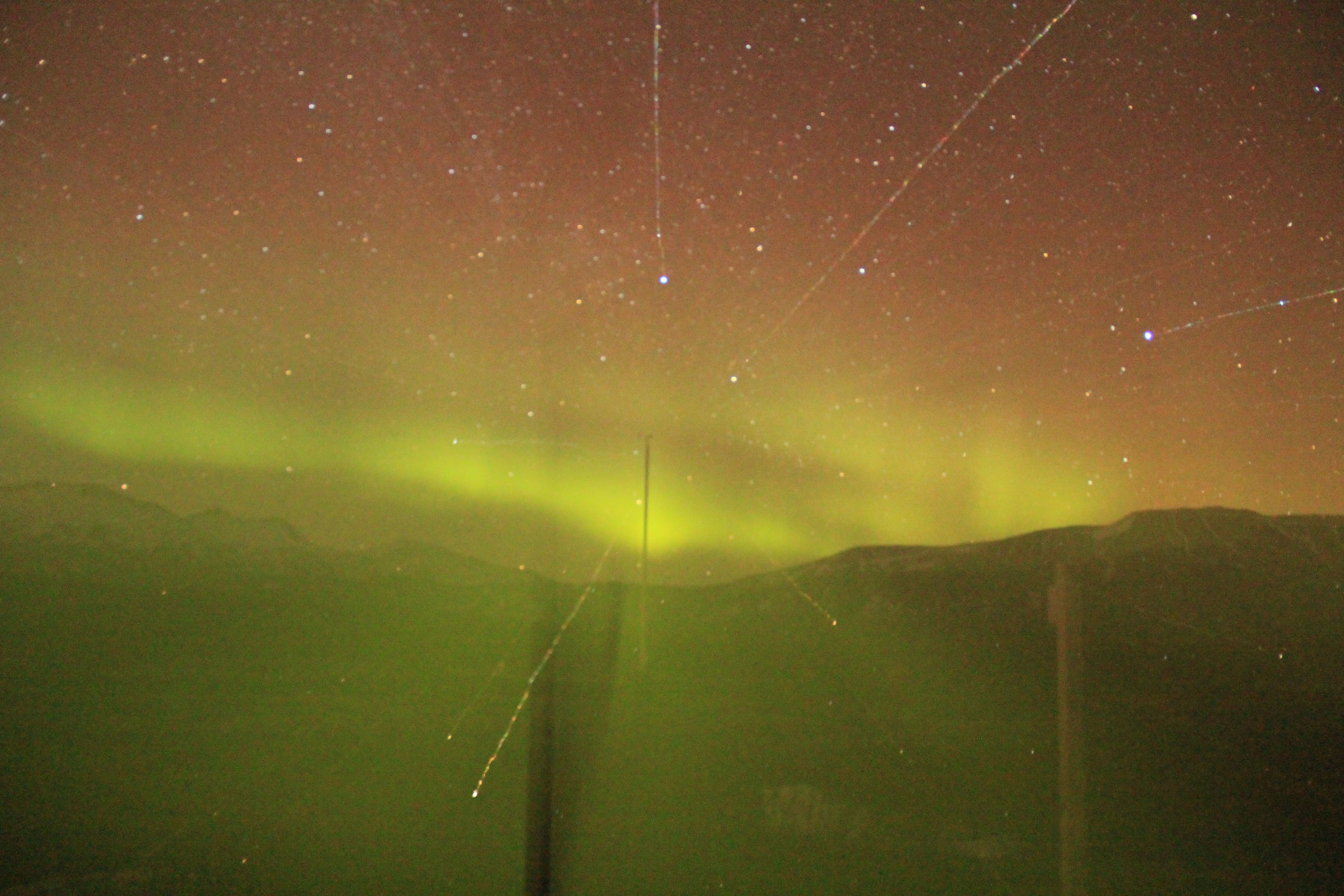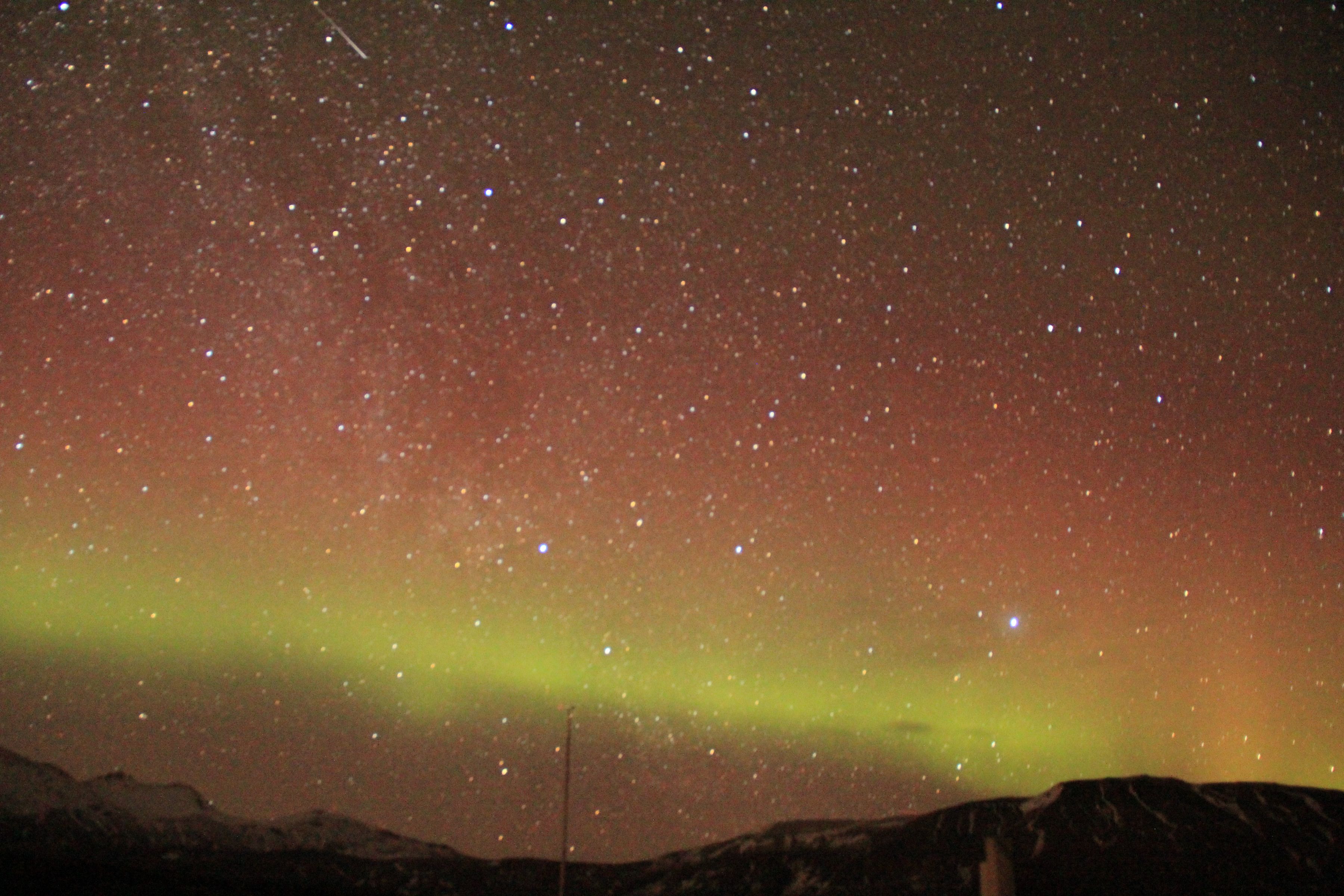 Northern Lights handheld and unimpressiveThere was a pale milky streak like a wimpy cloud hanging over the hillside to the north. But if you watched it long enough you’d notice that it was in fact slowly shifting and changing. I huddled next to my new Taiwanese buddy Jin, taking pictures between moderately successful efforts to keep blood flowing in my fingers.
