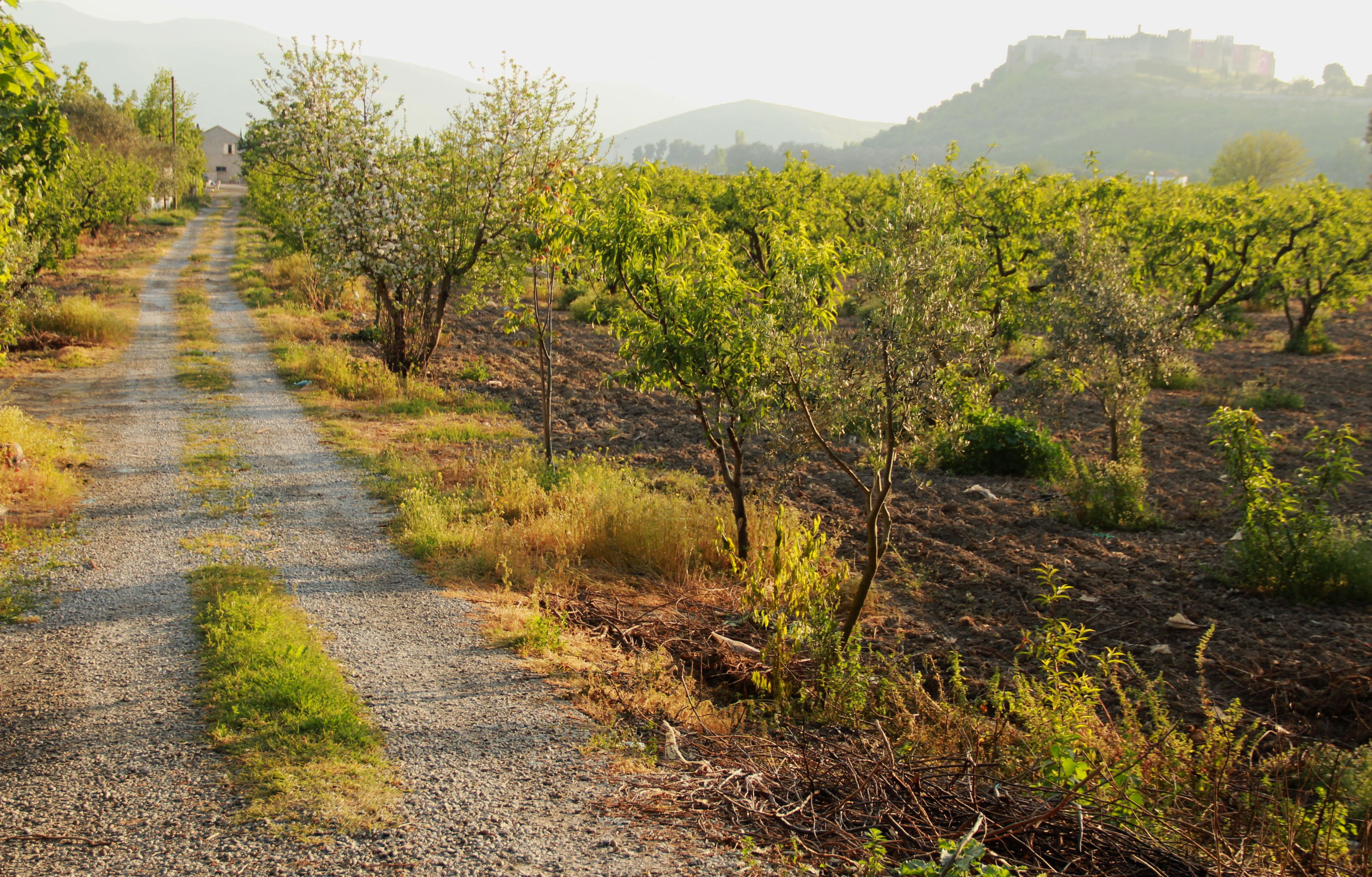 My bus was getting smaller in one direction, while from the other a tractor was approaching with more noise than speed, and to both sides stretched farm fields of small trees growing…something, presumably. Apricots?