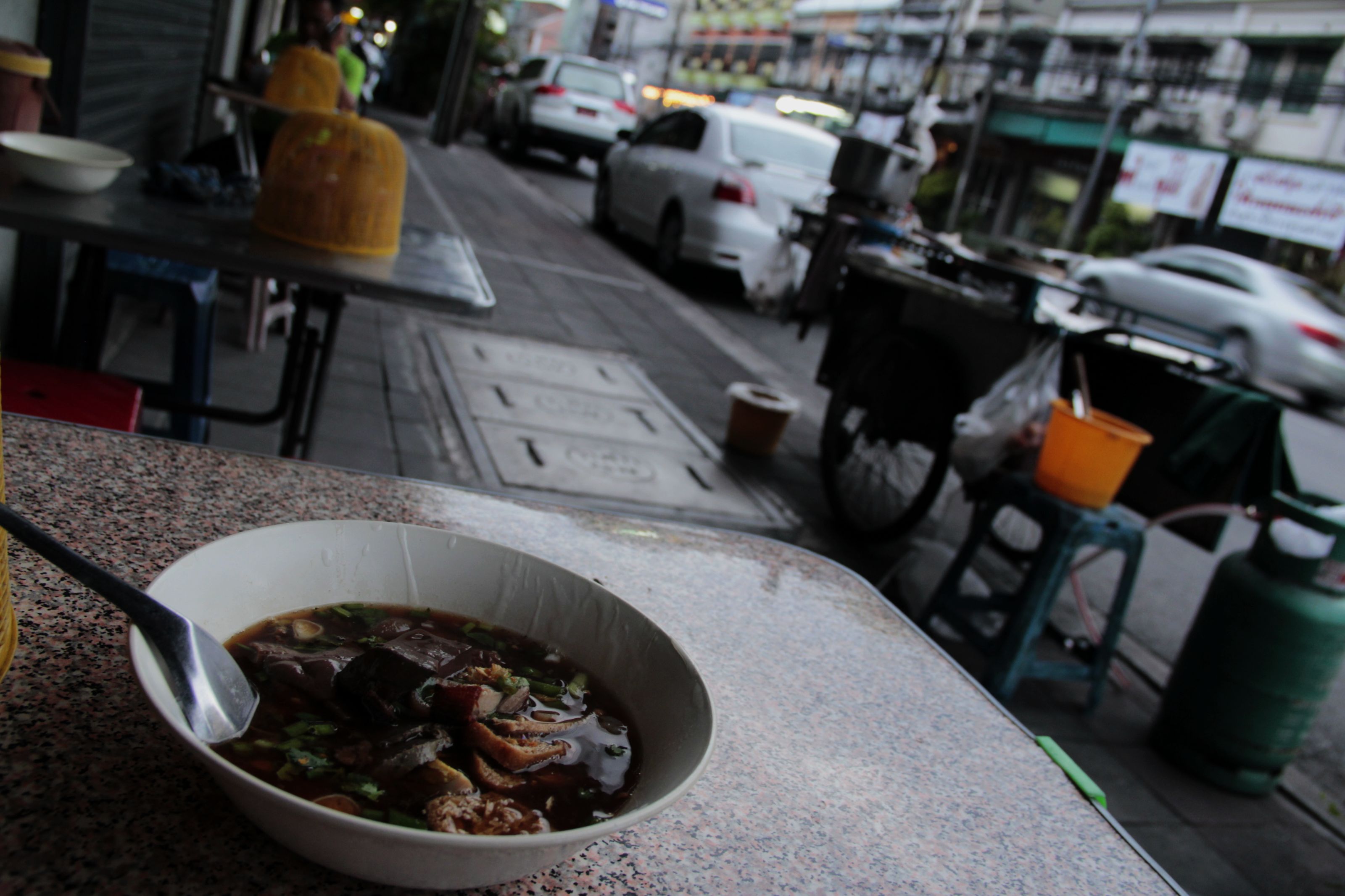The sun was trying to teach me about Thai culture with a hammer as I left my hotel a few hours after arriving in Bangkok, and my hair went straight from water-wet to sweat-wet without passing go. I wasn’t sure which way to walk, so was happy to see one of the mobile street carts that prowl the city set up down the block.