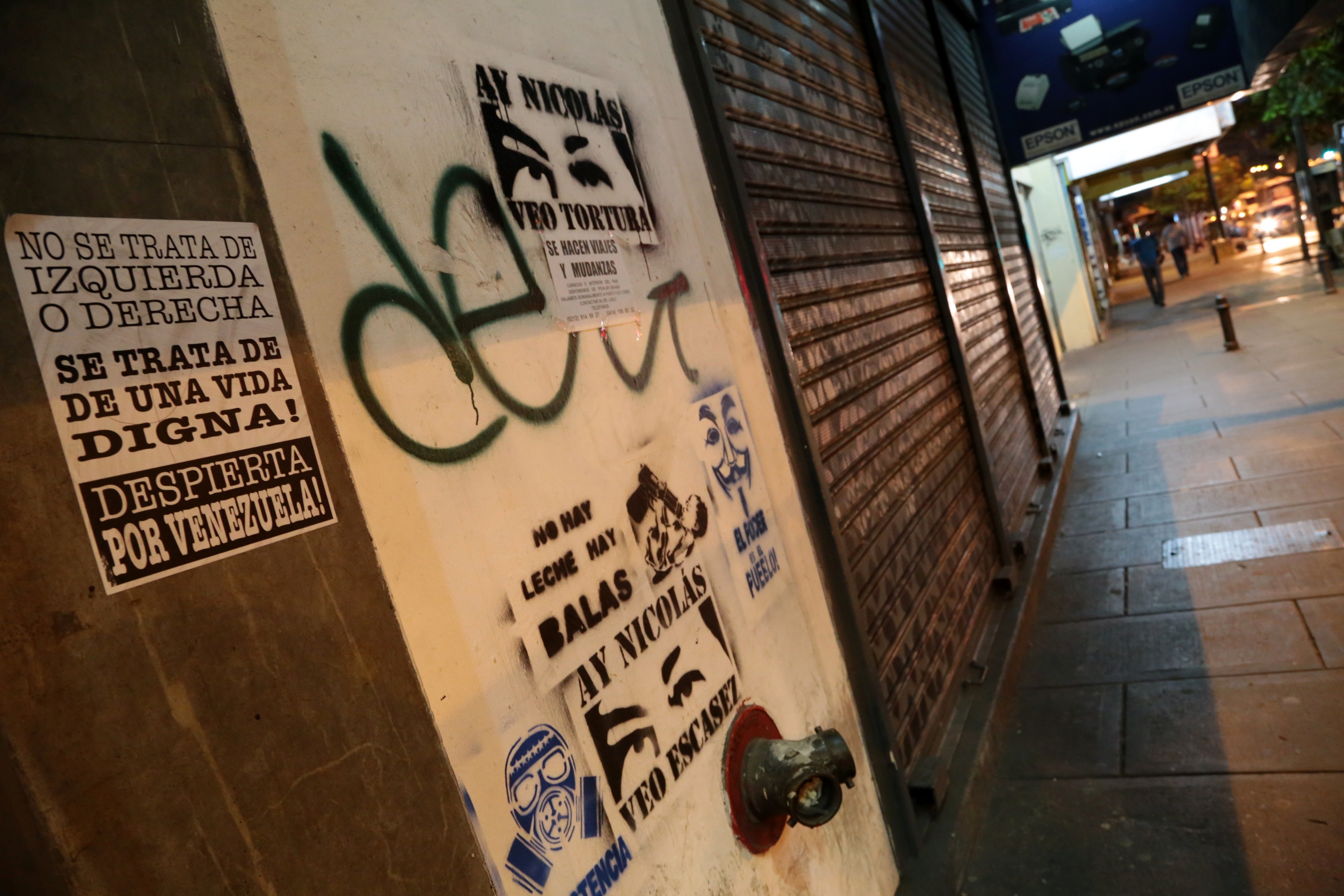 Caracas street with graffiti(The tags on this wall read: “It’s not about Left or Right, it’s about human dignity”, “The people are the power”, and the iconic eyes belong to Chavez, painted across the country with lamenting cries to Nicolas Maduro, Venezuela’s president and Chavez’s successor about the things they see, including scarcity, torture, corruption, and violence. But the most striking to me is the one in the middle, which reads “There is no milk, only bullets” and is an infant nursing from the barrel of a handgun.)