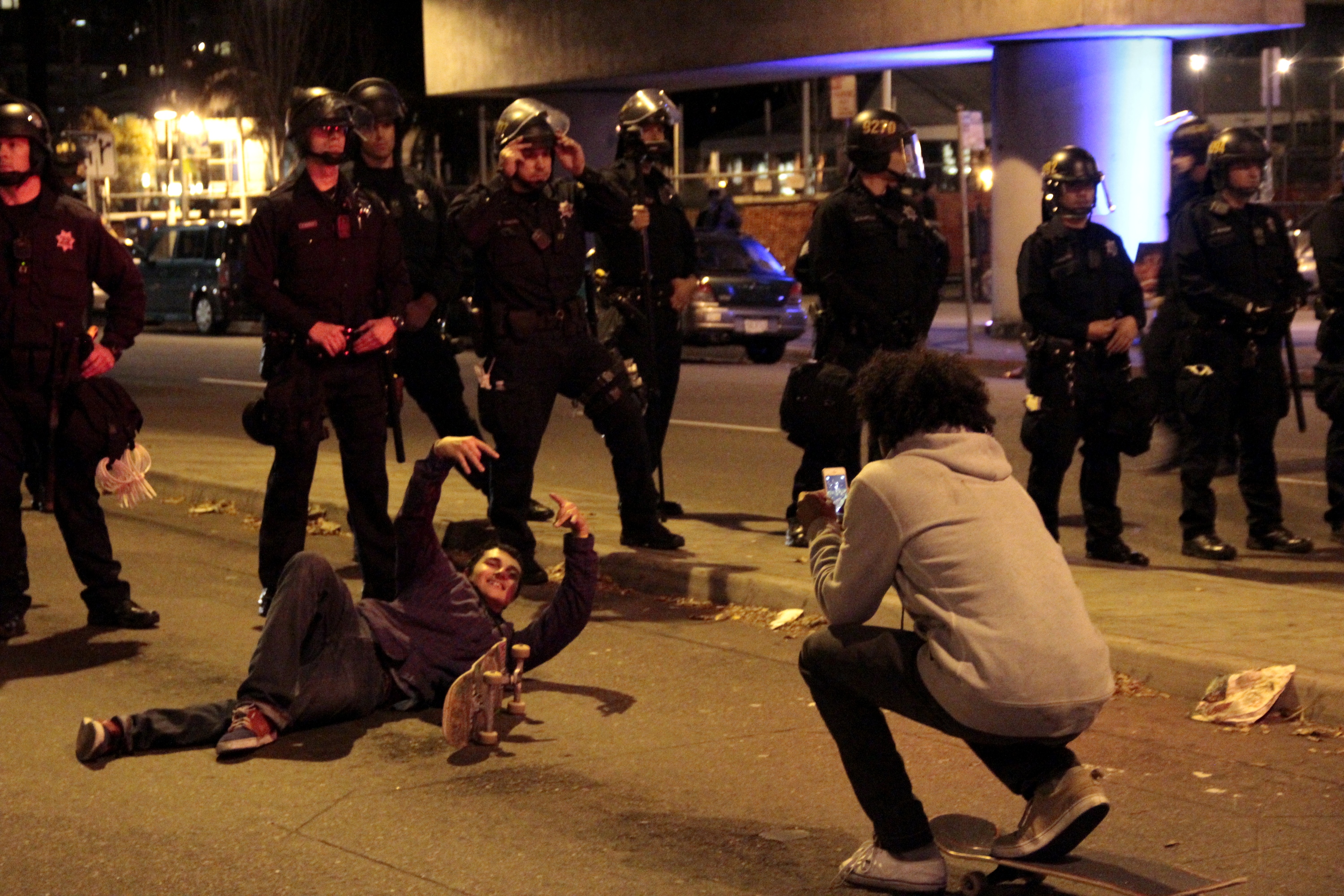 I was overseas when Oakland PD attacked the Occupy camp here, with the same tools but more brutality than tonight, and it is still a stain of disgrace on the city. Tonight? The police came out looking better than the protesters. Maybe Occupy was our big chance, our peaceful protest. Seeing how that went nowhere, what else is there to do but smash?