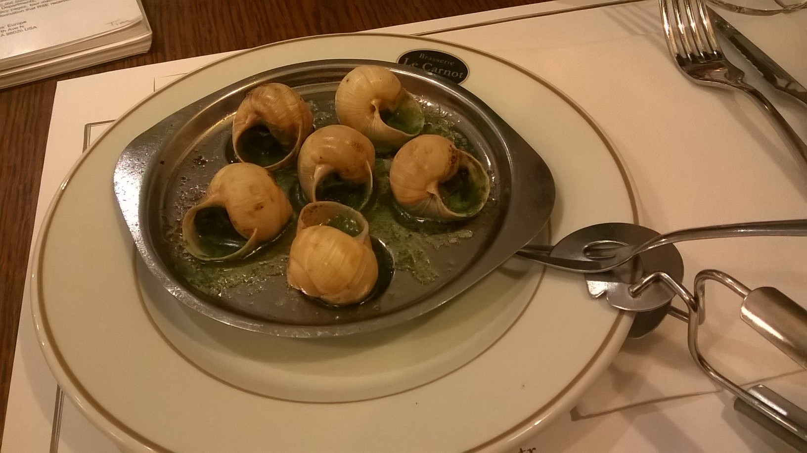 But do real life Bourgondiers eat only this apogee of beef stew? Non non non! The meal began, of course, with a small metal plate like a watercolor palette, each of whose half dozen concave niches held an impressively large snail shell. The verdant green of the herb and garlic sauce erupting around each mollusc was delicious to the eyes. Escargot, si vous plaits. Très délicieux!