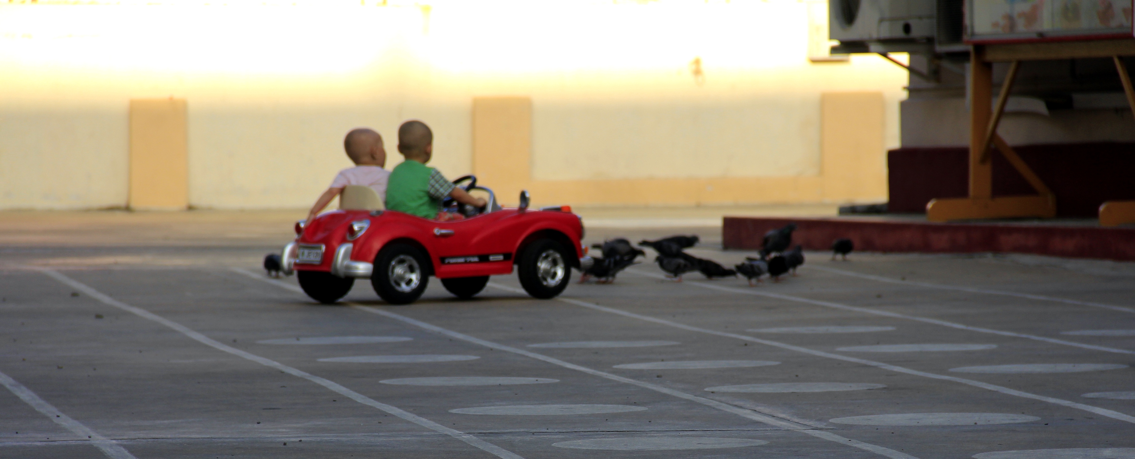 Some sort of Chinese enclave. Where was everyone? At work? Not yet here? Vampires waiting for sundown? But then I realized I wasn’t actually alone. Two mothers were on duty in the quiet heat. The first woman followed an imperious little boy riding a small bicycle with training wheels, bubble wrap still sheathing the bars of the frame. The second trailed a motorized car moving at a speed so slow it couldn’t scare the pigeons, who eventually moved aside with desultory head wags, ambivalently monitored by the two egglike children placed in the seat. The buzz of the small motor only accentuated the breathless stillness of the place, the honks and hum of vivacious Mandalay kept away by concrete.