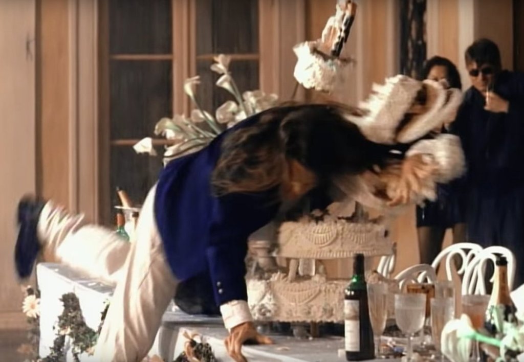 I think that shade of purple only existed in the 90’s. Why oh why does cake diver have to dive through the frickin wedding cake? Can’t he just join Duff who’s having a perfectly fine time under the table, sheltering from the murderous death rain? Why is there murderous death rain? The cold November rain isn’t that cold. Unless it’s heroin?
