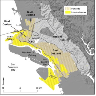 For those who are not familiar with Oakland, here’s a quick demographic primer. The Oakland hills are extremely wealthy, the foothills are upper middle class, and the flatlands are the working class expanses that come to mind when you hear the word Oakland. After passing my place, I-580 hugs the hills. All the traffic that would otherwise pass along it is rerouted via Interstate 880. Guess where 880 runs. Yup, right through the flatlands.