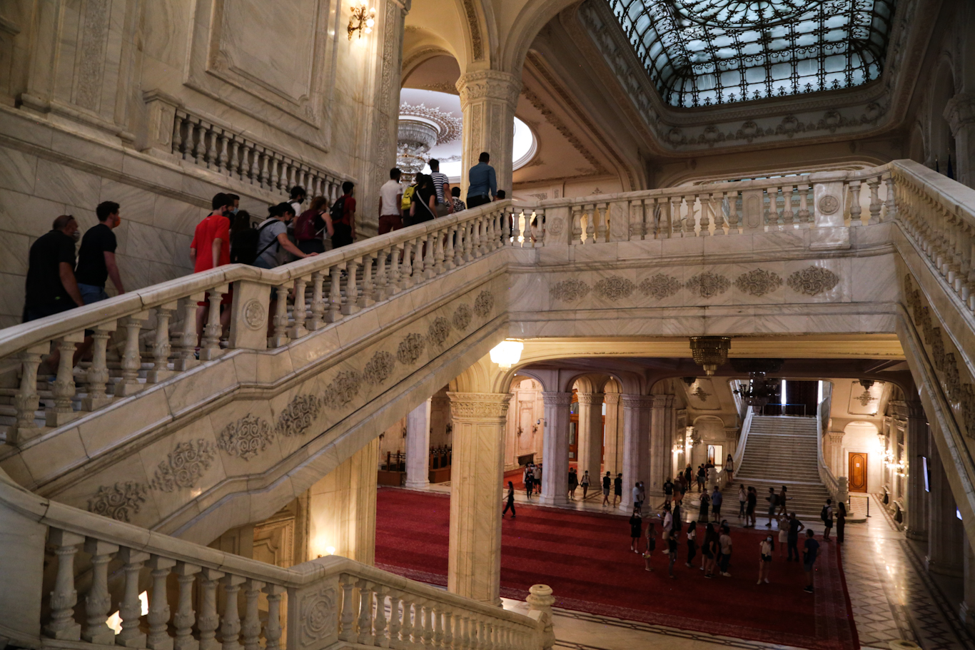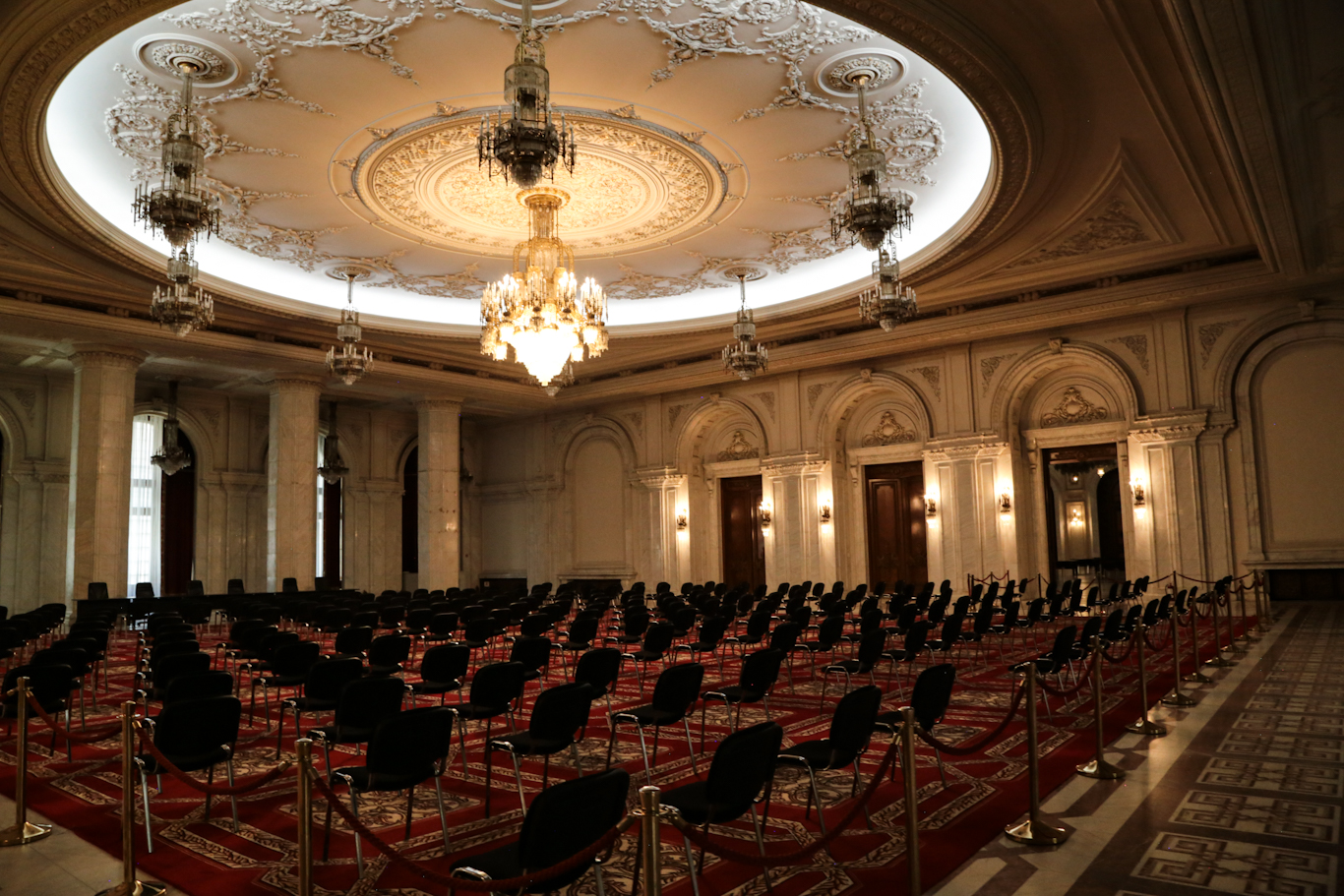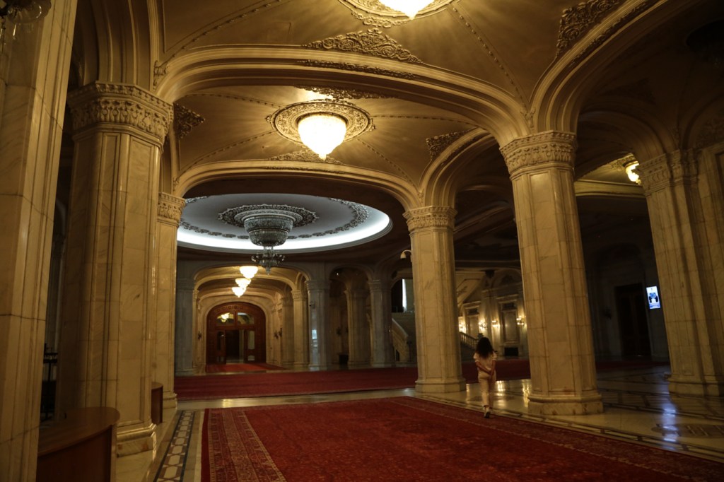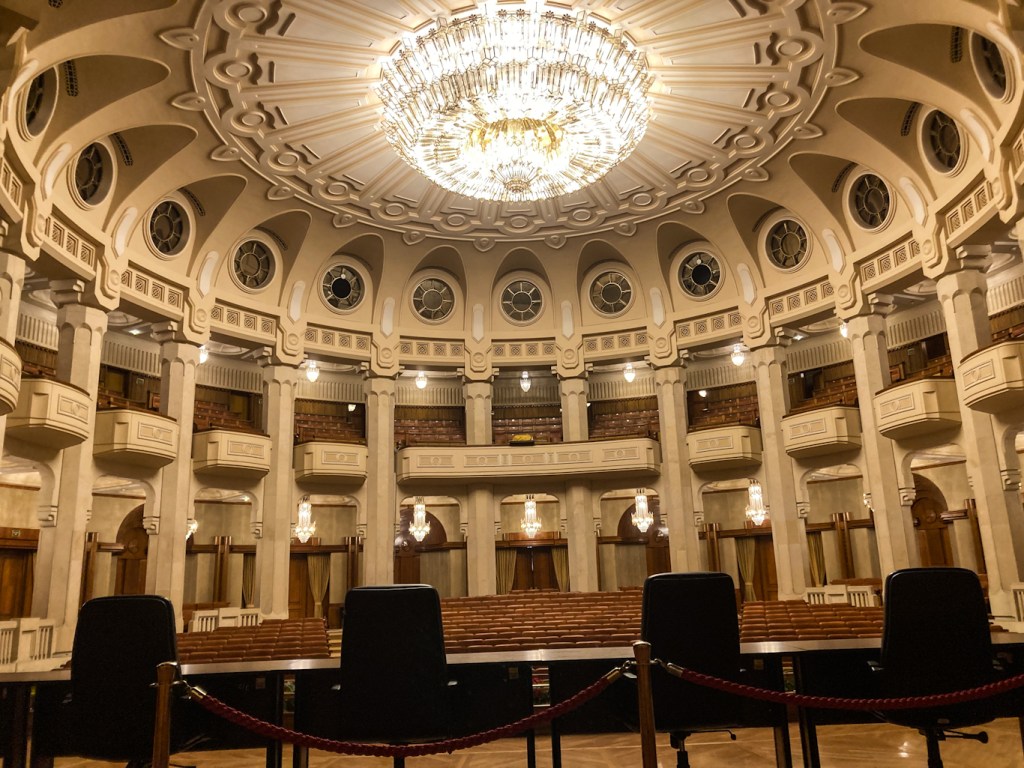 The factoids are striking. The world’s heaviest building (4,098,500,000 kilograms) and larger by volume than the Great Pyramid at Giza, it’s sinking 6 mm per year as it compacts the very earth below. A million cubic meters of marble, and nearly as much (900k) wood for intricately decorative parquet and wainscoting. Add 3,500 tons of crystal for 480 chandeliers (our guide said 2,800 but that can’t be right, can it?) and special machines were brought in to weave together massive carpets to cover 200,000 of the total 365,000 square meters of floor space. (The vast majority of those materials were sourced and processed in Romania.) It houses both chambers of Romanian Parliament, three museums, and an international conference center (that hosted NATO’s 20th annual summit, in 2008).