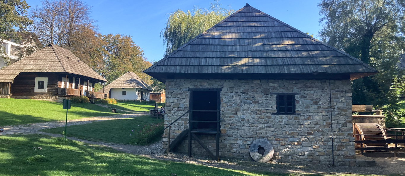 As the late summer sun shone on the green grass and a soft wind tickled the trees just turning their autumn colors, I explored a blacksmith’s forge, an outdoor kitchen for summer months, and a wooden oil press that was still being used in the 1960’s (and potentially in 2007 when it was bought for the museum). My favorite was the waterwheel-driven mill bought from a monastery, where the miller lived in a cubby-like space within the mill, whose millstones could run nonstop during the harvest season, grinding 2400 kg (5291 lbs) of grain each day. That monastery was in the town of Humor, because what could be better than the Monastery of Humor?