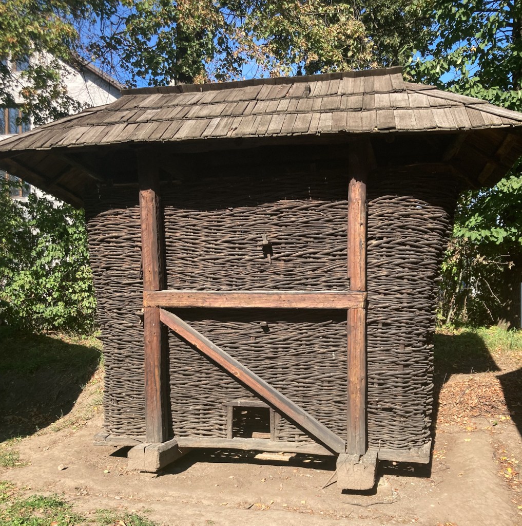 The ongoing presence of traditional living in the Romanian countryside was clear when I examined a crop warehouse in one of the homesteads. Built of woven sticks, it looked a lot like an enormous wicker laundry hamper, with four hatches at the top for depositing corn, apples, or other crops, then a smaller hatch at the bottom for their removal. It was familiar, because I’d been seeing these structures in backyards for weeks as I took slow trains across the country.