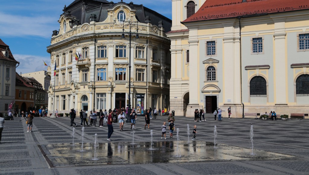 My eyes finished their circumnavigation of the beautiful square, then came back to the centerpiece, the grand Holy Trinity Jesuit Church, whose interior is (of course) stunning, and whose Baroque belltower stands over the passage between the Big Square and the Small Square, Piata Mica. But even better than the church walls were the children laughing in one of those fountains that irregularly and unpredictably squirts water into the air.