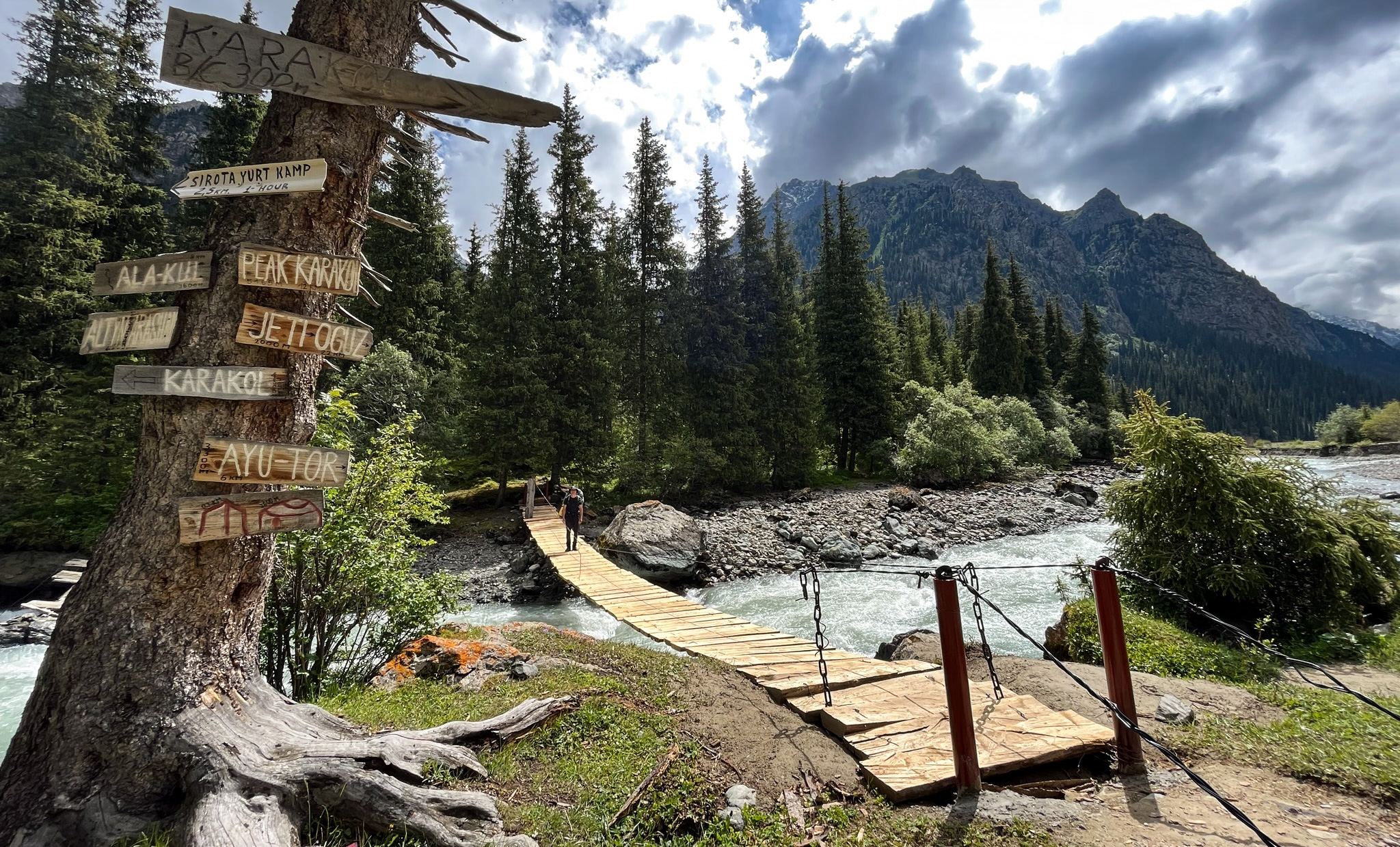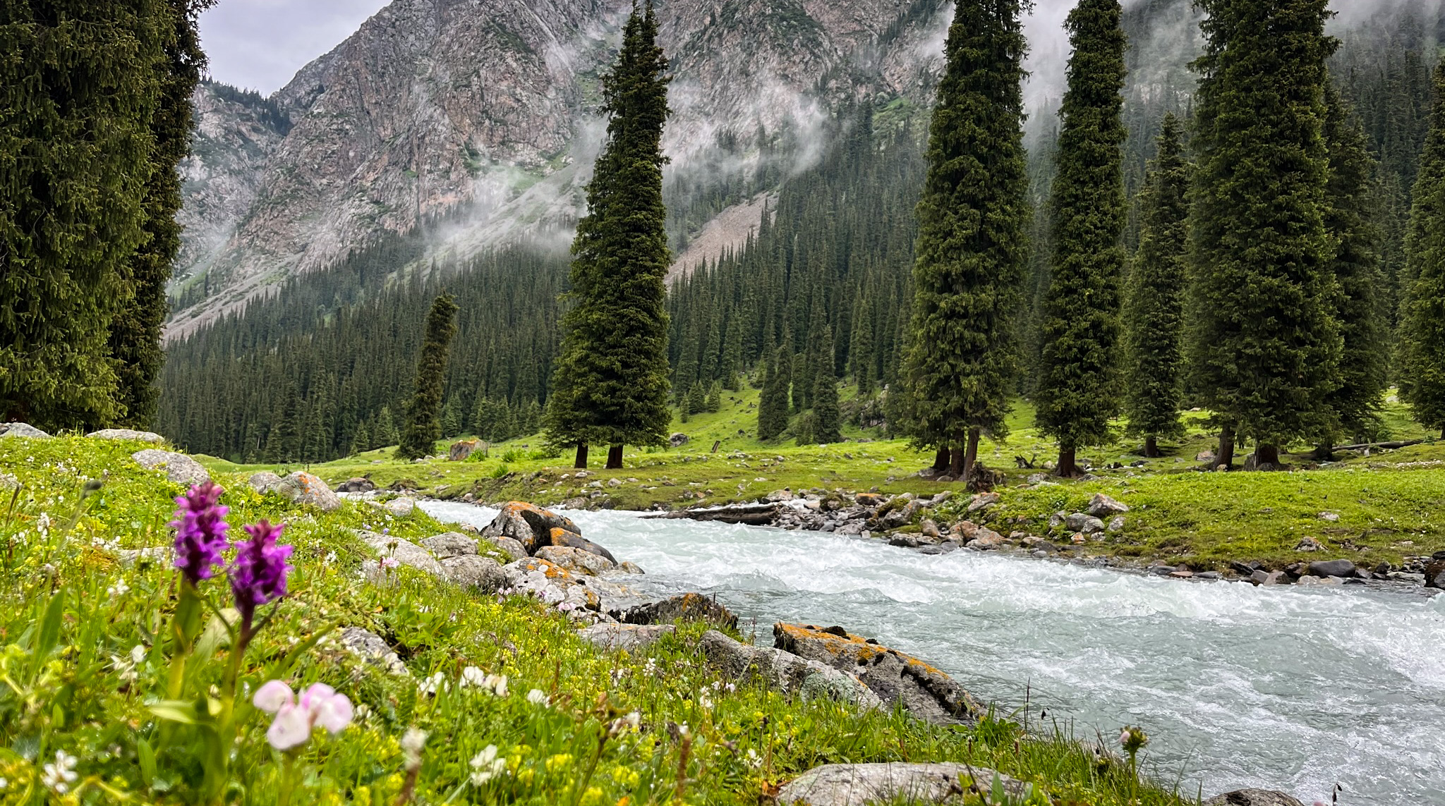 It was the best of campsites, it was the worst of campsites, but first we had to get there. Day Four started in another perfect mountain valley, whose light green-blue river of melted glacier memories ran between tall conifers sleeping in the mist at the uppermost limit of their range. The sharp mountain walls had acquired a new dusting of snow overnight, but down in the valley everything was water. Calm horses watched us break our fast from the far bank, while a few cows perused our side. Their hooves had churned up the spring, so I got as close to the source as I could before filling my bottles, and decided the little flecks of floating stuff were just mountain salad.