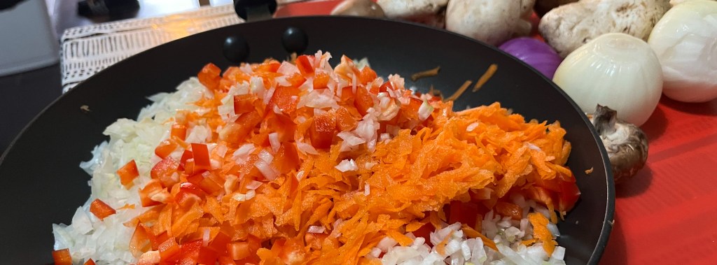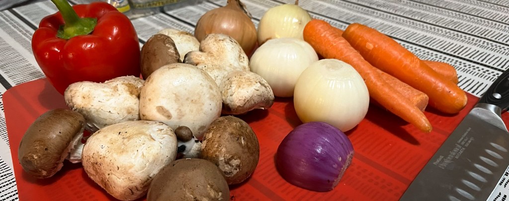A friend made a traditional meat recipe, which was excellent, but since I’ve been eating more than my share of the beasts of the field lately, we opted for a vegetarian version instead. Our stack of mushrooms, onions, carrots, and bell peppers crowded the cutting board. We had to saute the mushrooms in a separate pan because it was too much for one dish. You know you’re doing something right when that happens.