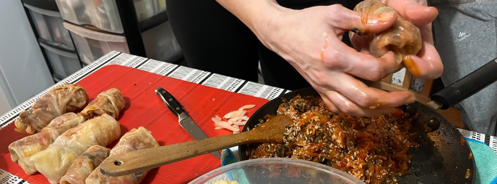 Once everything was ready, we combined them, added the (uncooked) rice, and got our hands dirty. Other cuisines cook or freeze the cabbage leaves to soften them, but Romanian sarmale uses pickled cabbage, so they’re a bit like un-shredded sauerkraut. This makes them easier to work with and adds a special complexity to the end product.