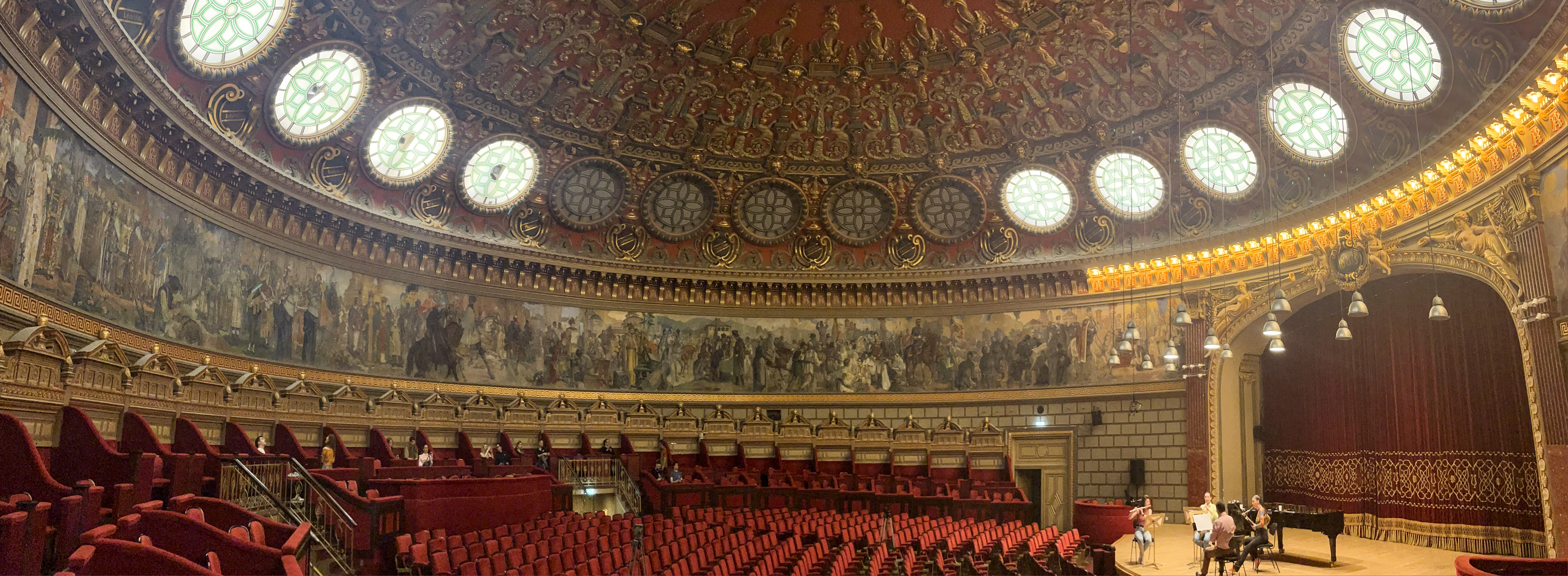 Stepping inside I am always a little caught off guard by the sensuality. Instead of straight rows of columns and right angles we find sweeping curves that evoke Istanbul’s Hagia Sophia, but go further to take that neoclassical love of geometry and bring it nearly to organic life. Ribs and arches like the spirit of art nouveau, but instead of botany it’s Byzantium, a Contantinople that grew up in Paris. Customary austere white walls and intimidating black lines are nowhere to be found, replaced by intimate pinks and yellows that make the place seem more Atlantean than Viennese. Staircases don’t march to the heights, they curve seductively into the shadows, whispering of belle epoque trysts and Ottoman schemes. It is a concert hall crossed with the sultan’s harem.