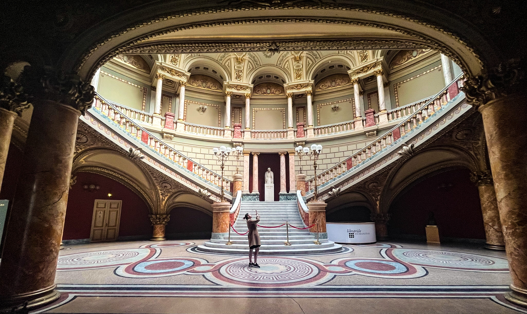 Architecture beginners like me can see the neoclassical style as a return to the Renaissance’s love of geometric simplicity and logic, in contrast to ornate baroque excess, and built large to impress. So straight lines and symmetry, supersized. Think of cavernous ballrooms with paired columns and either blank white walls or angular pattern decorations, with a giant staircase like a ladder to heaven. The Athenaeum has this neoclassical Western tradition because Romania is quintessentially European, both in lineage and self definition. But as with all the best places, they took an original source and amplified it.