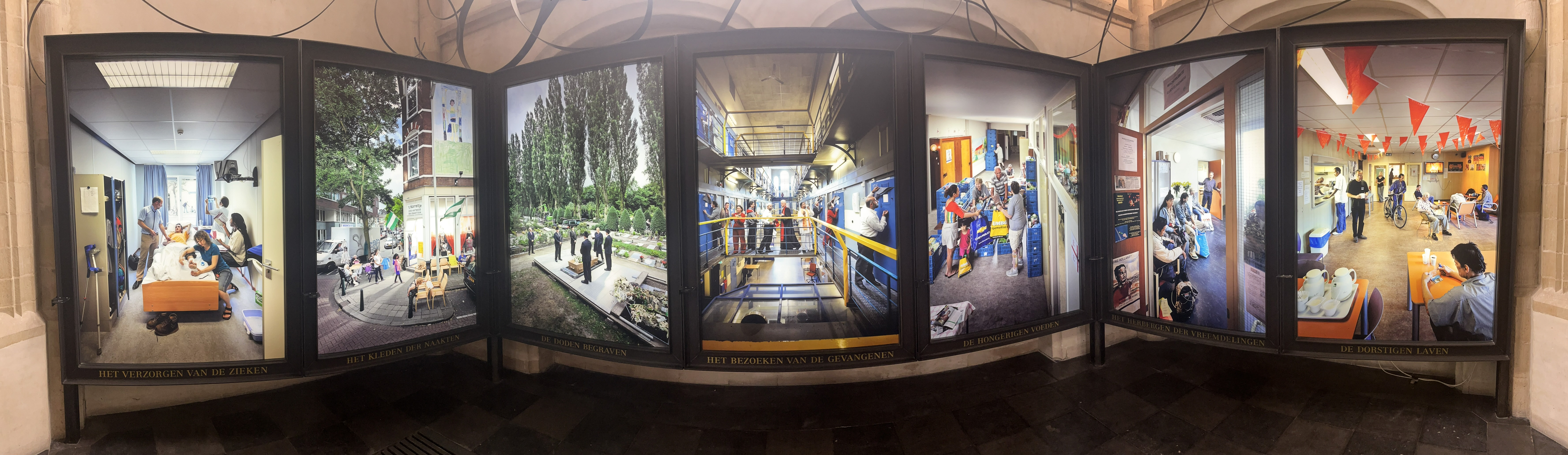 This hung in Rotterdams big old church and shows the 7 holy virtues (the less famous counterpart to the 7 deadly sins) demonstrated in the modern day. The penultimate shows “harboring the strangers” and is an immigration office