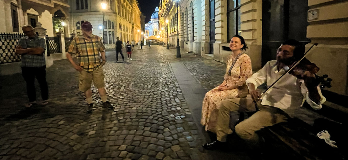 The orientation meeting went extremely well, dinner was positively delicious, and my introductory walk around Bucharest was going splendidly. The after-heat evening air was hot with both the indolence of summer and the eagerness of travelers, and even the cats seemed to wink at us in cooperation. I had just finished talking about the National Bank robbery (which wasn’t a bank robbery) when the sound of a violin eased around the corner ahead.